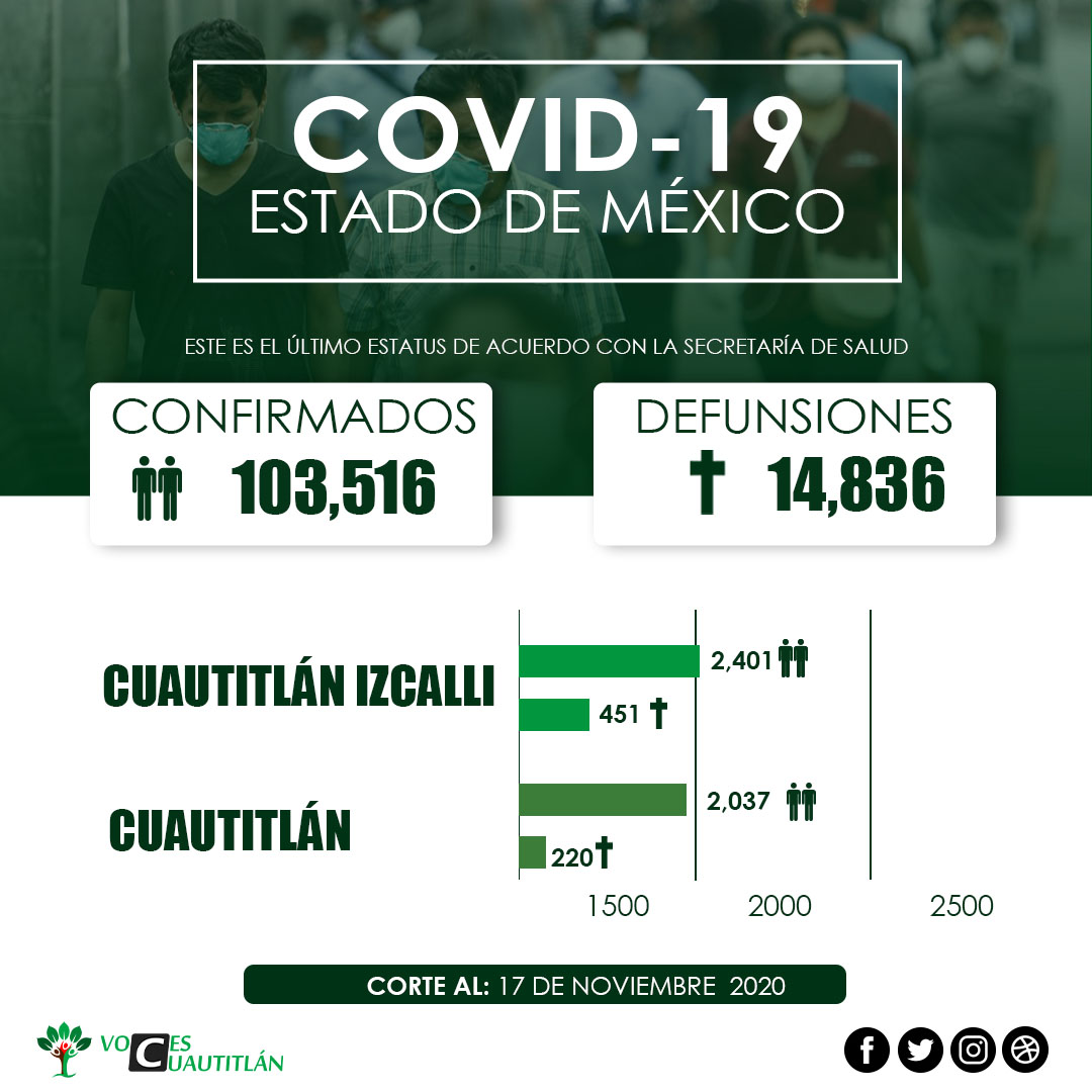 El Estado de México registra 103 mil 516 casos acumulados a COVID-19, con 60 mil 841 casos sospechosos y 14 mil 836 defunciones, al corte del 17 de noviembre de 2020.